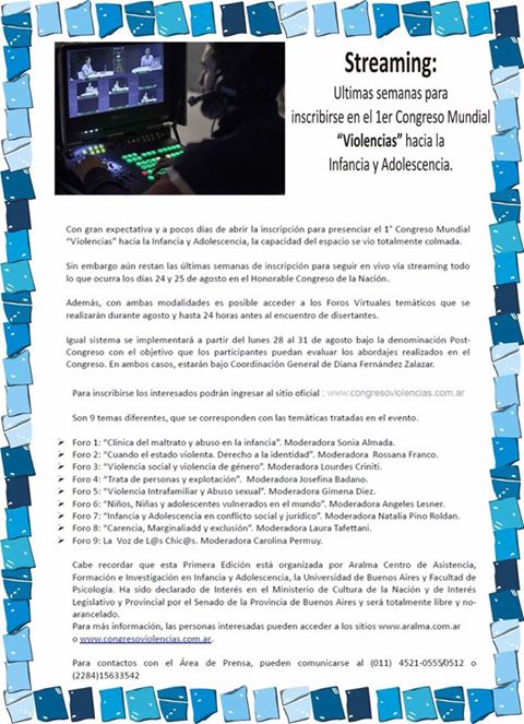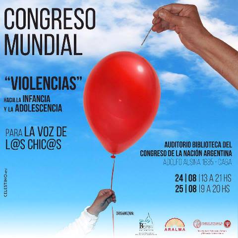 El próximo 24 y 25 de agosto se realizará el 1° Congreso Mundial “Violencias” hacia la Infancia y Adolescencia organizado por la Universidad de Buenos Aires, Facultad de Psicología y Aralma Centro de Asistencia, Investigación y Formación en Infancia y Adolescencia