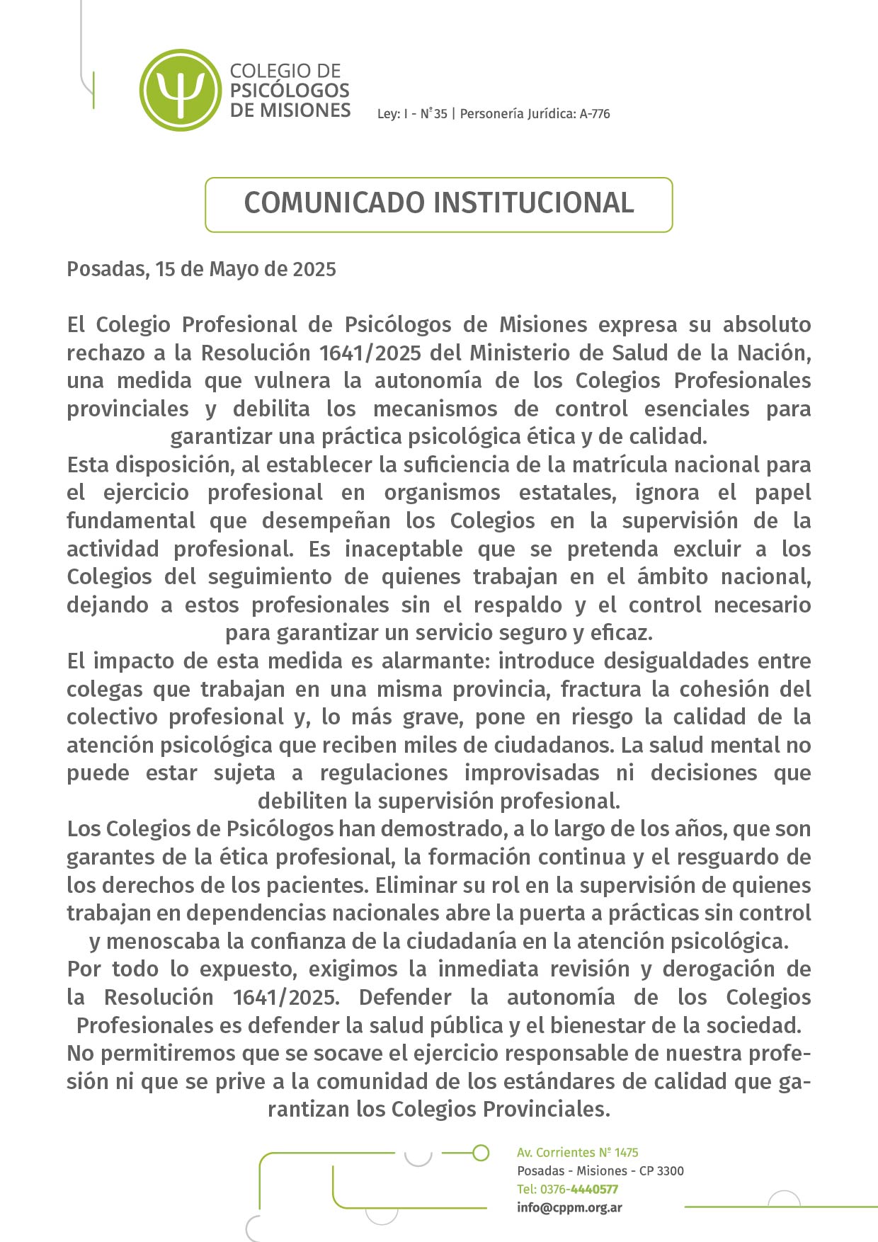 COMUNICADO: Respecto a la Resolución 1641/2025