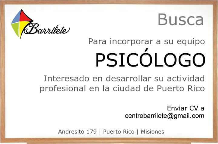 Convocatoria de psicólogo Centro Barrilete (Puerto Rico, Mnes)