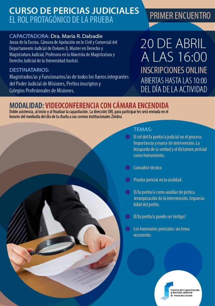 Desde el Centro de Capacitación y Gestión Judicial invitan a participar del Curso de Pericias Judiciales, en el que se darán 4 Encuentros, que serán transmitidos Vía Cisco Webex.