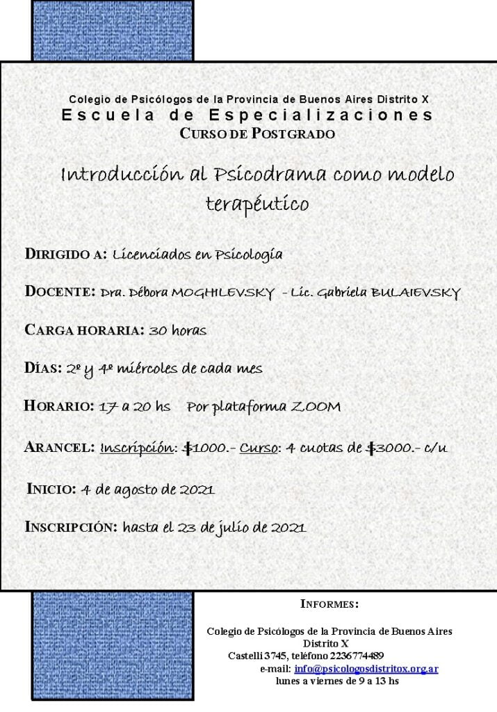 El curso se dictará desde el Distrito X del Colegio de Psicólogos de la Provincia de Bs. As. en modalidad on line. Dicho curso comienza en Agosto y la inscripción se realiza según los datos del flyer y/o visitando la página del Colegio, Distrito X, Mar del Plata.