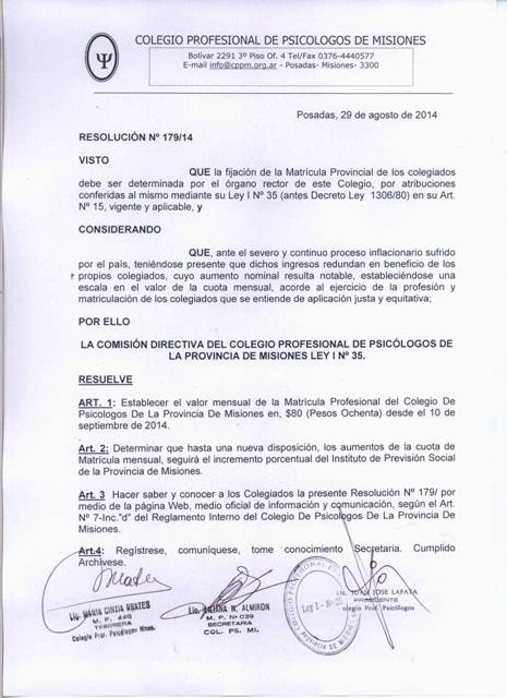 Informamos que por Resolución Nº 179/14 de fecha 29/08/14, a partir del 10 de septiembre de 2014 el valor de la cuota mensual de matrícula será de $ 80.-