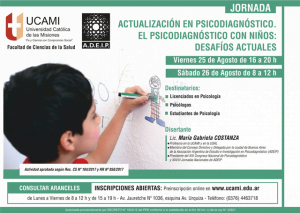 Se encuentran abiertas las inscripciones a la Jornada de Actualización en Psicodiagnóstico. El Psicodiagnóstico con Niños: Desafíos Actuales, que se llevará a cabo los días viernes 25 de Agosto de 16 a 20 hs y sábado 26 de Agosto de 8 a 12 hs en el Campus de la UCAMI, ubicado en Jauretche Nº 1036, esquina Av. Urquiza.
