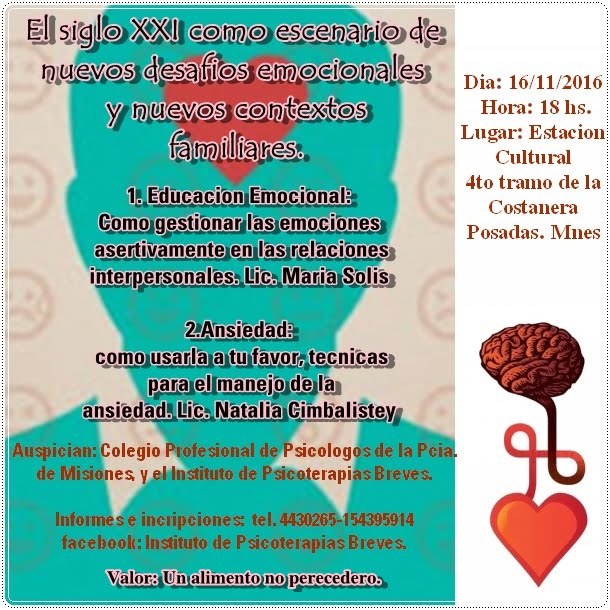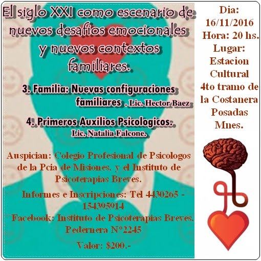 Jornadas a llevarse a cabo el día miércoles 16 de noviembre, organizadas por el Instituto de Psicoterapias Breves bajo el título “El siglo XXI como escenario de nuevos desafíos emocionales y nuevos contextos familiares” y auspiciadas por el CPPM según Resolución Nº 289/16.-