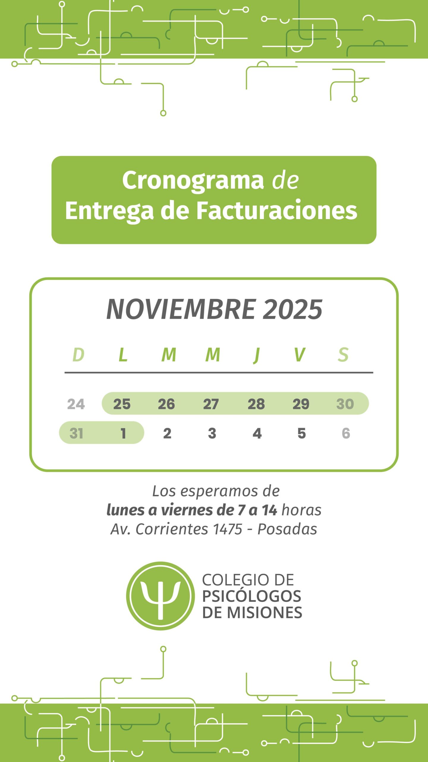 6. El prestador luego de recibido ese informe por email, confecciona un solo RECIBO O FACTURA por el total presentado (en caso de tener débito, restar ese importe del total). Enviar por email al Colegio: info@cppm.org.ar . El recibo debe ser a nombre del Colegio Profesional de Psicólogos de Misiones – CUIT: 33-66058575-9  IVA: Exento)