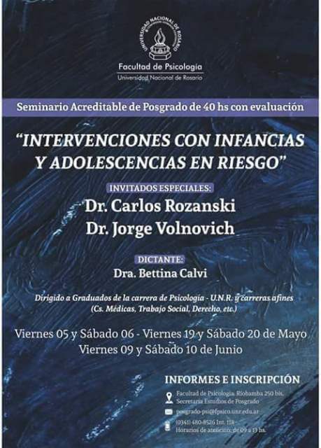 La Secretaría de Posgrado de la Facultad de Psicología de la Universidad Nacional de Rosario, invita al Seminario Acreditable de Posgrado: “INTERVENCIONES CON INFANCIAS Y ADOLESCENCIAS EN RIESGO”. Dictado por la Dra. Bettina Calvi, y con el Dr. Carlos Rozanski y el Dr. Jorge Volnovich como docentes invitados.