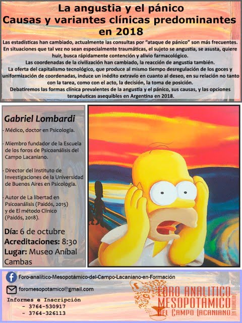 El Foro Analítico Mesopotámico del Campo Lacaniano (en formación) invita al seminario “La Angustia y el Pánico. Causas y variantes clínicas predominantes en 2018” del Dr. Gabriel Lombardi a realizarse el día sábado 6 de Octubre.