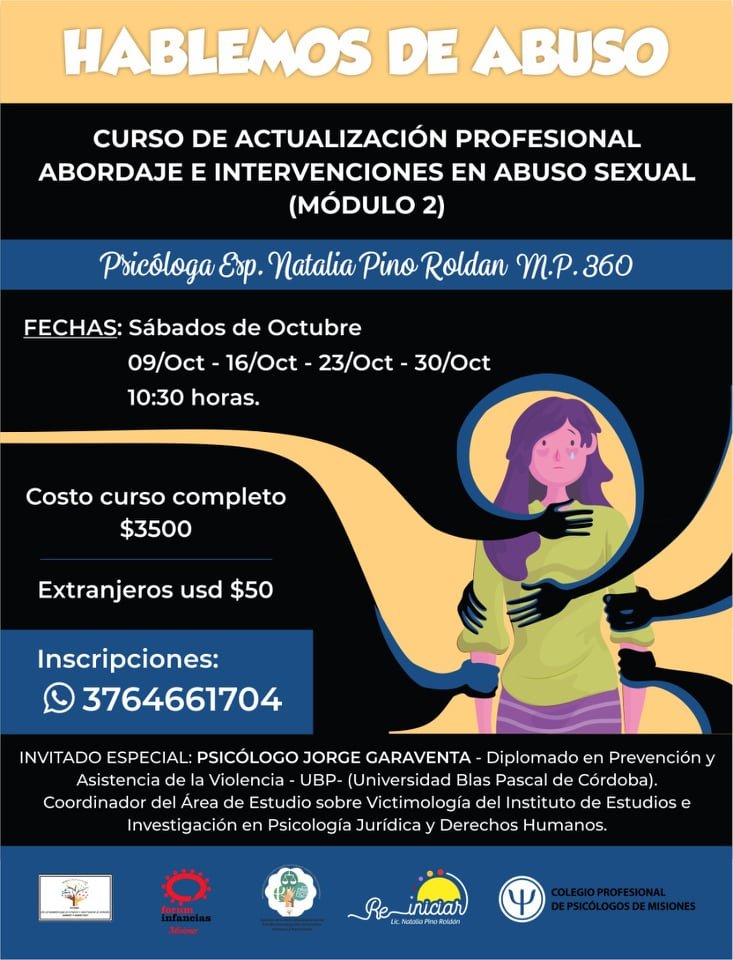 “HABLEMOS DE ABUSO” Un curso dirigido a padres, madres, docentes, referentes sociales, estudiantes universitarios, que quieran tener una primera aproximación a las características del abuso sexual, los síntomas a los que debemos estar atentos y la escucha empática al tomar conocimiento, como así también, la responsabilidad legal.